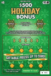 $500 HOLIDAY BONUS is a $5 scratchers from the California Lottery with overall odds of 1 in 4.